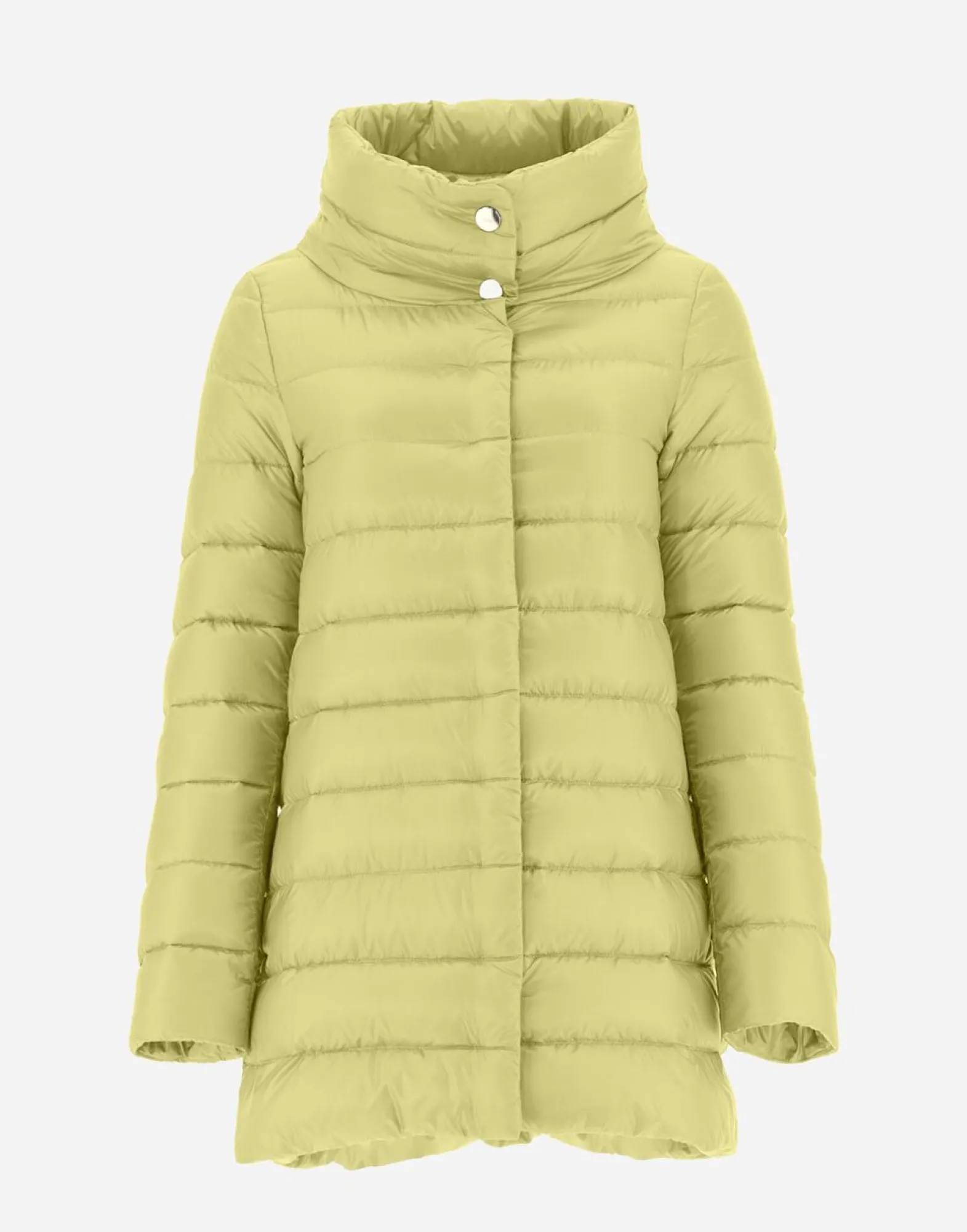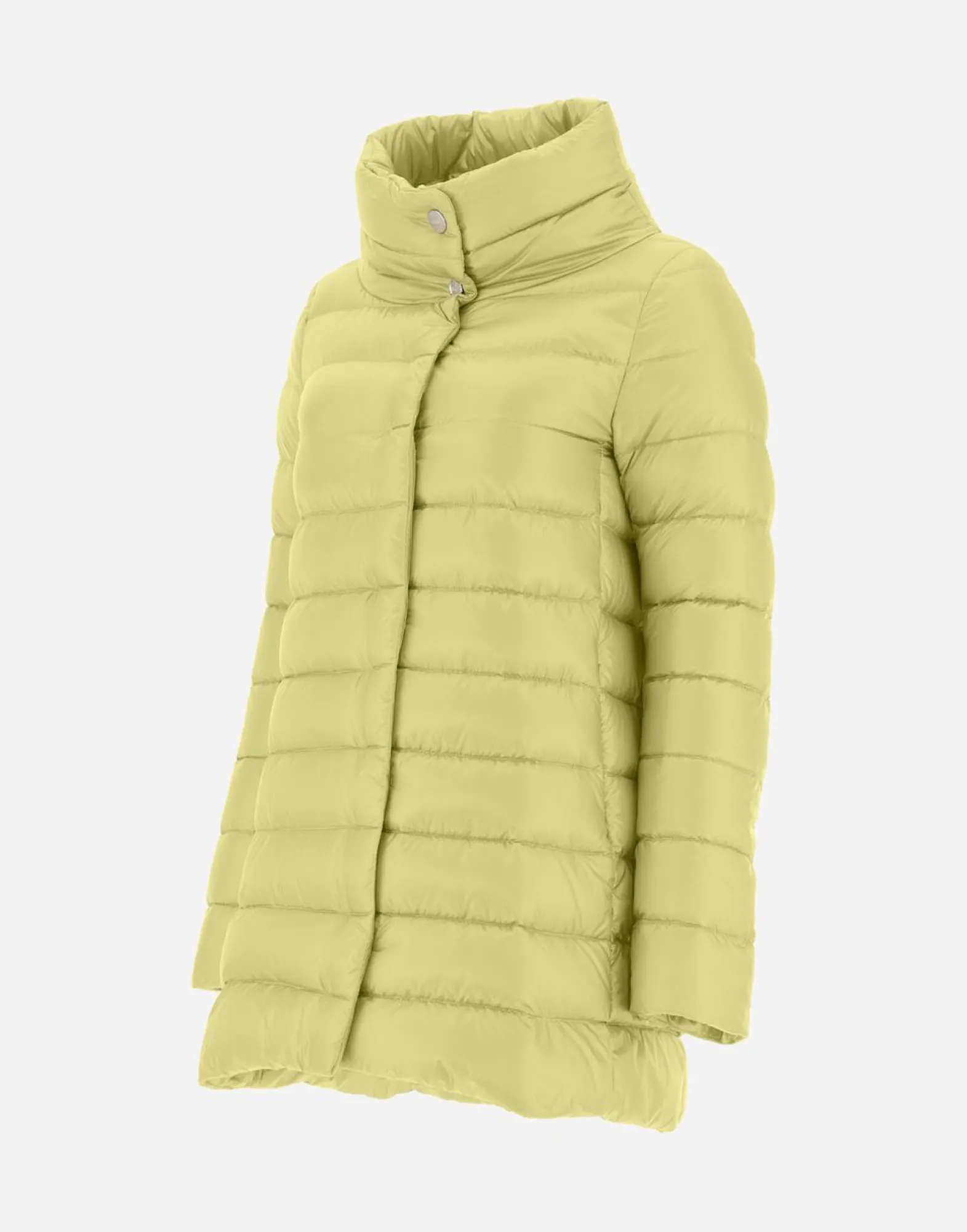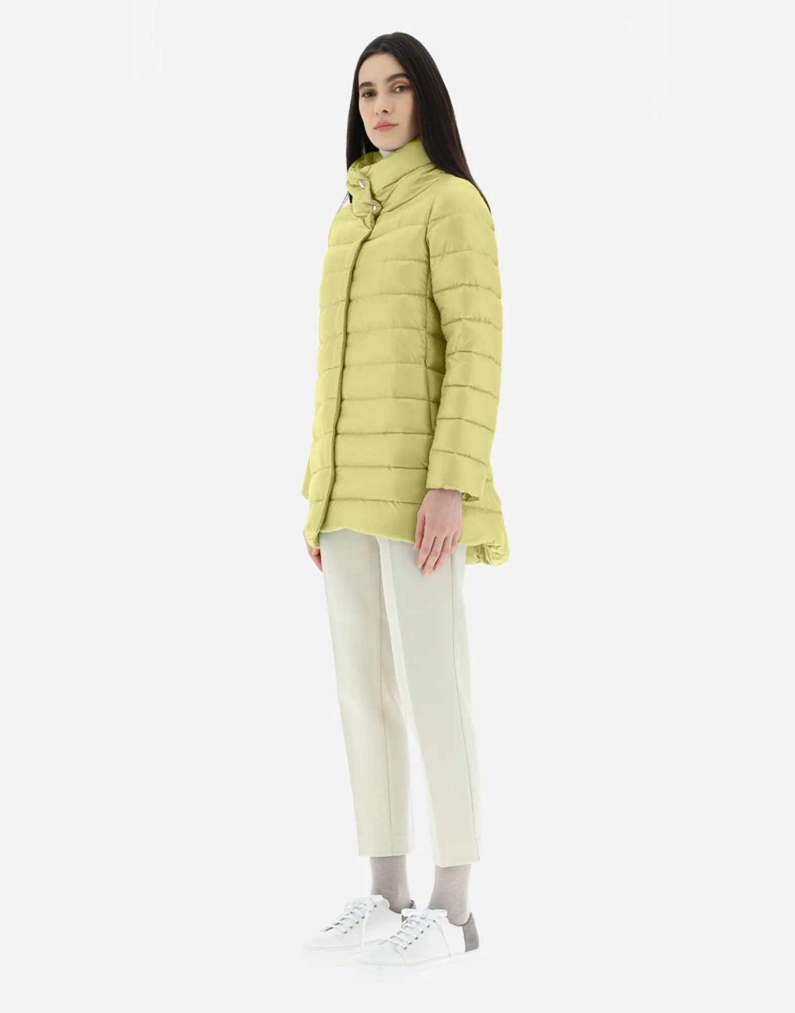 L’Imbottitura Ad Iniezione In Finissima Piuma D’Oca E Il Nylon Dall’Effetto Serico Rendono Il Capo Estremamente Leggero E Impalpabile.